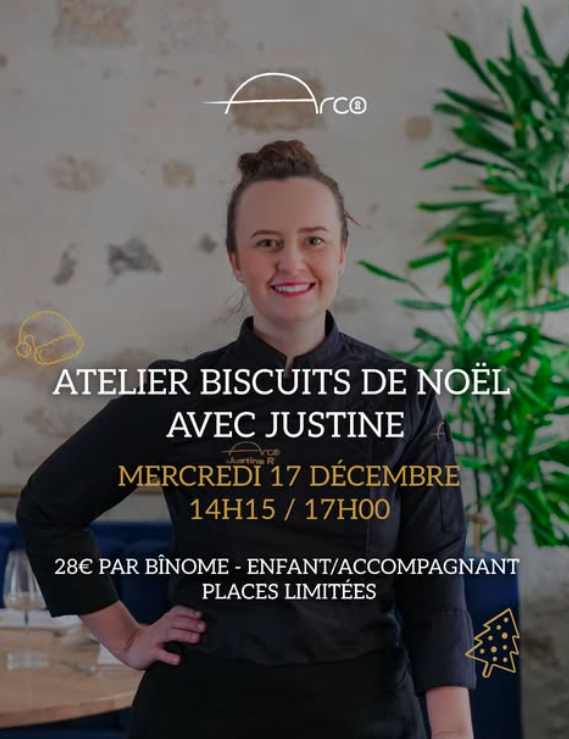 Résumé rapide : Le restaurant Arco organise un atelier biscuits de Noël pour enfants le 17 décembre à La Rochelle. Une activité gourmande animée par la cheffe pâtissière Justine, idéale en binôme enfant-accompagnant.