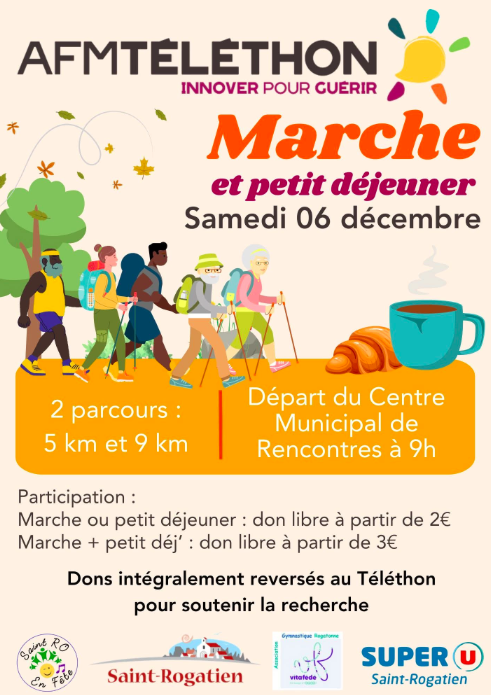 Résumé rapide : La matinée Téléthon de Saint-Rogatien propose une marche solidaire, un petit déjeuner et des animations au profit de la recherche. Rendez-vous le 6 décembre à partir de 9h au Centre Municipal de Rencontres.