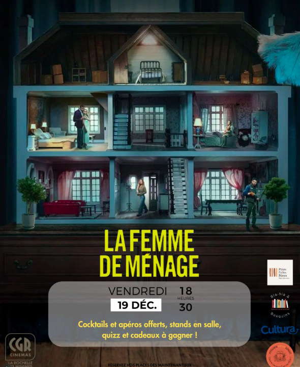 Résumé rapide : Le CGR La Rochelle Les Minimes organise une avant-première exceptionnelle du film La Femme de Ménage le vendredi 19 décembre. Dès 18h30, profitez d’apéros et cocktails offerts, de stands en salle et d’un quiz avec cadeaux, avant le lancement du film à 20h00.