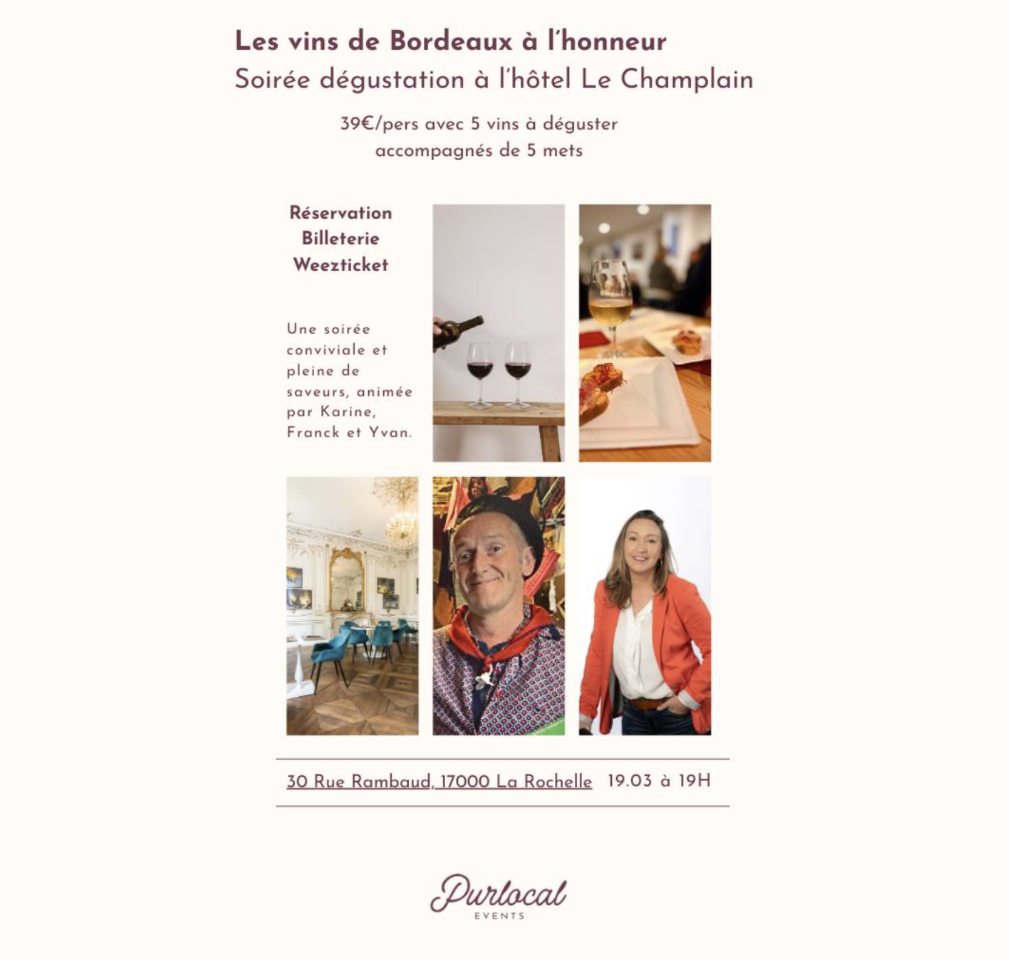 Purlocal Events vous propose une nouvelle soirée dégustation dans le cadre élégant de l'Hôtel Le Champlain à La Rochelle. Une occasion privilégiée de mettre le terroir bordelais à l'honneur lors d'un moment convivial et riche en saveurs.