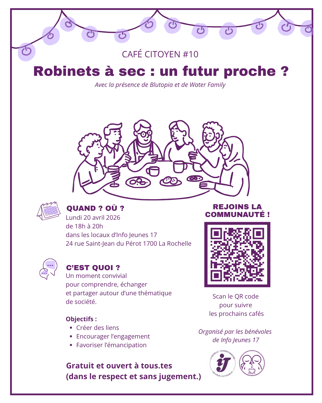 Le lundi 20 avril 2026, les bénévoles d'Info Jeunes 17 vous invitent à un nouveau Café Citoyen. Un rendez-vous mensuel gratuit et ouvert à tous pour réfléchir ensemble aux grands enjeux de société.