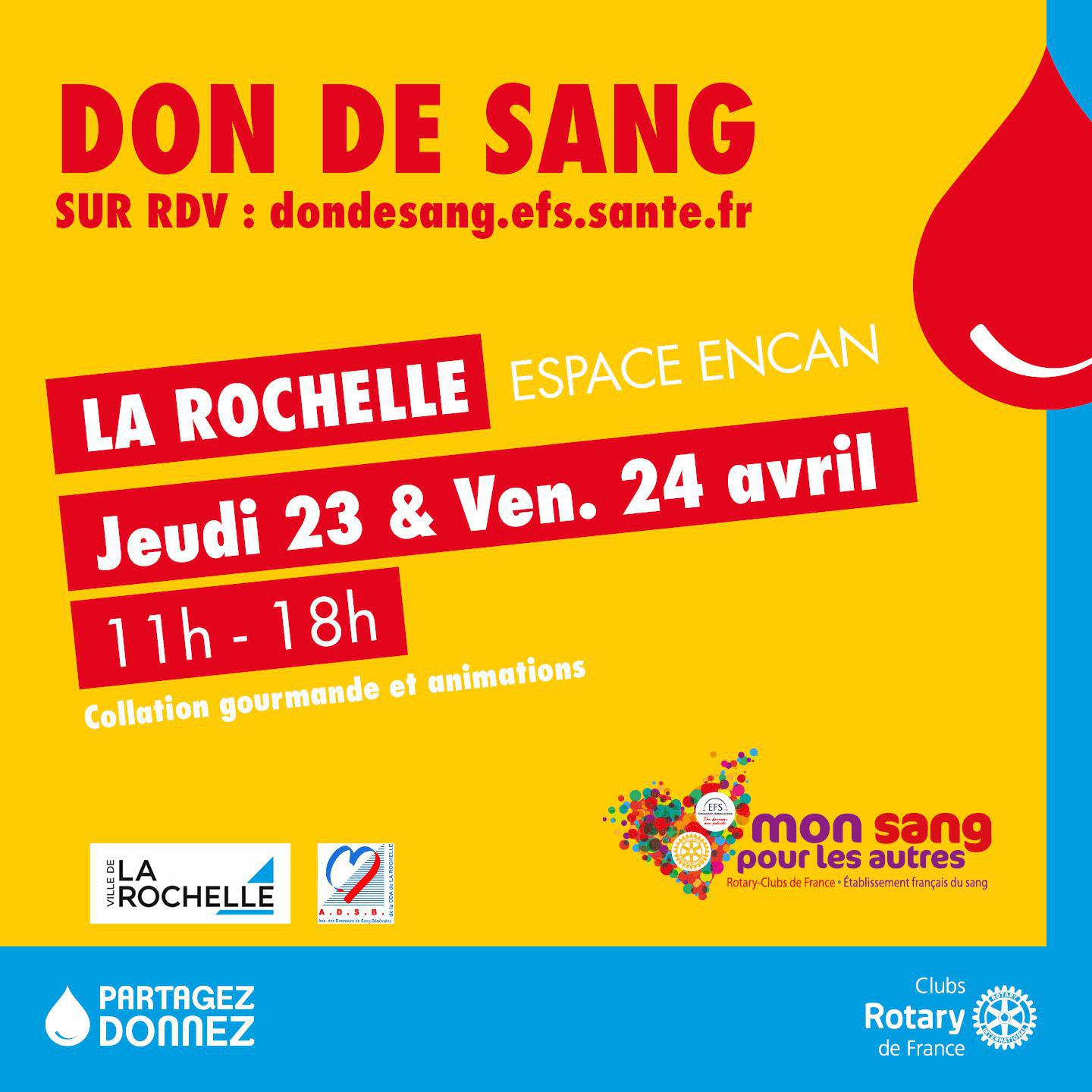 Le jeudi 23 et le vendredi 24 avril 2026, l'Espace Encan accueille une collecte de sang hors du commun. En partenariat avec le Rotary Club de La Rochelle, l’Établissement Français du Sang (EFS) vous propose une expérience de don conviviale et solidaire.