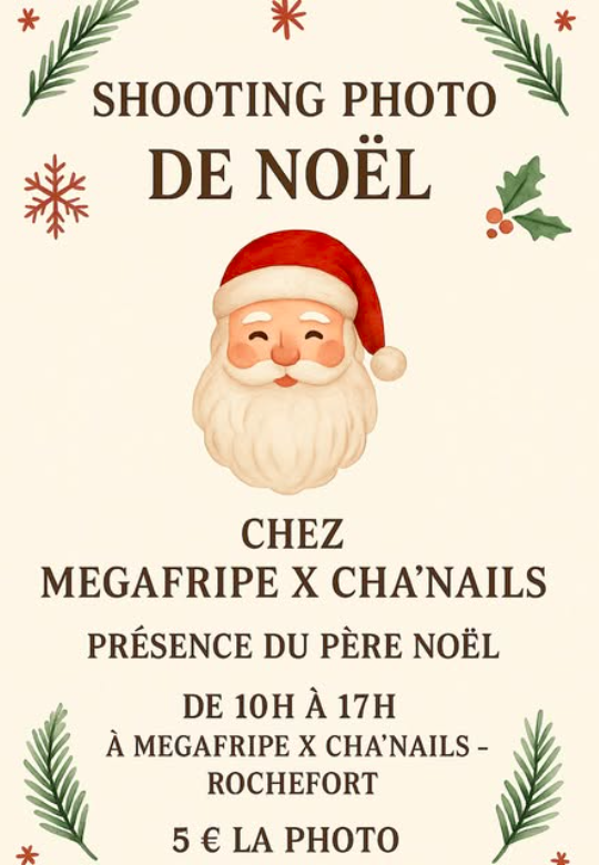 Résumé rapide : Megafripe x Cha’Nails organise un shooting photo de Noël le 6 décembre à Rochefort. Le Père Noël sera présent toute la journée et les photos imprimées seront proposées à 5 €.