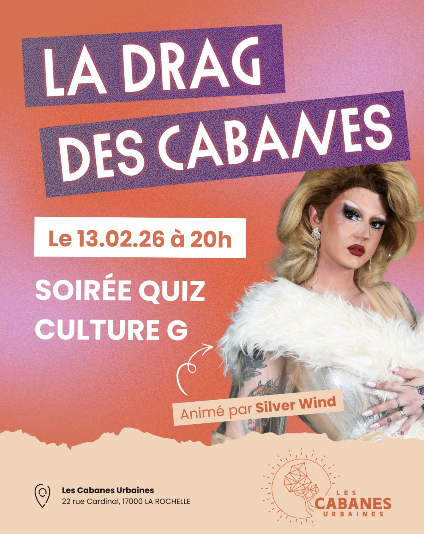 Participez au Grand Queerz aux Cabanes Urbaines à La Rochelle, une soirée quiz culture générale déjantée animée par la flamboyante drag queen Silver Wind.