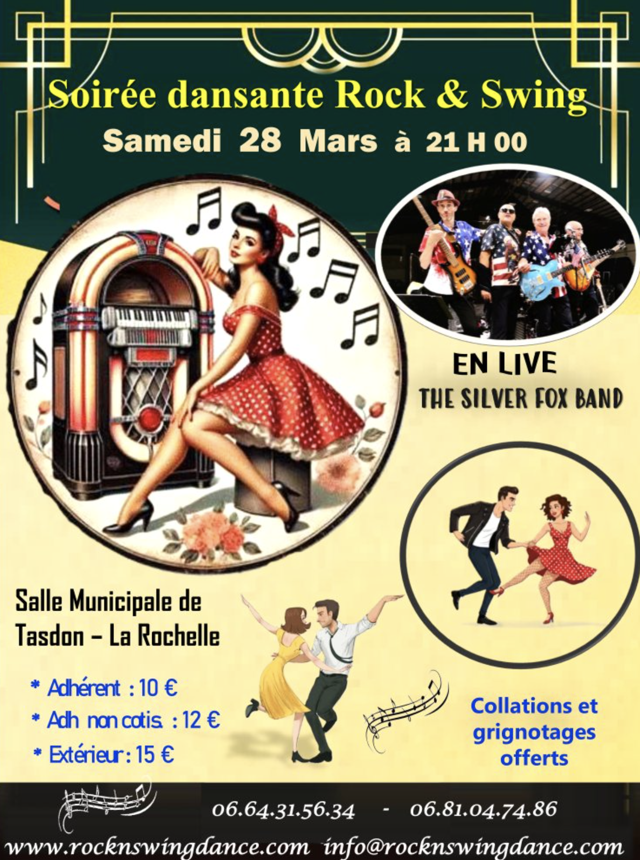 L'association Rock'n Swing La Rochelle vous convie à une nuit mémorable sous le signe du rétro et de l'énergie. Dès 21h00, profitez du concert live des Silver Fox Band pour une ambiance authentique. Pour agrémenter votre soirée, des collations et grignotages sont offerts par l'organisation. Un événement incontournable pour les passionnés de danse et de musique live dans le quartier de Tasdon.