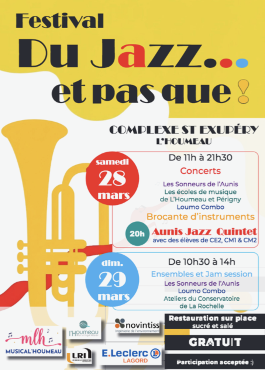La journée débute dès 11h avec une brocante musicale (vente et échange d'instruments) jusqu'à 18h30. Les concerts s'enchaînent ensuite : musique traditionnelle celtique avec Les Sonneurs de l'Aunis (15h), prestations des élèves de Musical'Houmeau (15h45), ateliers Jazz de Périgny (16h30) et Loumo Combo (17h30). La soirée se clôture en beauté avec l'Aunis Jazz Quintet à 20h, accompagné par les élèves de CE2, CM1 et CM2.