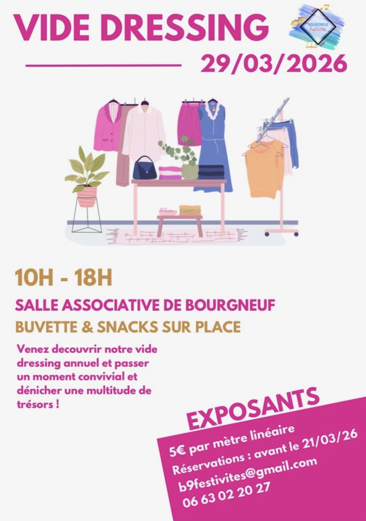 Avis aux amateurs de mode et de bonnes affaires ! L'association Bourgneuf Festivités organise son grand vide dressing annuel. Venez découvrir une multitude de trésors et offrir une seconde vie aux vêtements dans une ambiance chaleureuse.