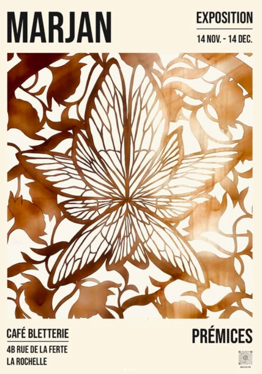 Pour cette première exposition, Marjan explore la fragilité et la puissance de la nature à travers un travail minutieux sur le papier. L’artiste invite le visiteur à un voyage sensoriel et symbolique où la lumière joue un rôle central. L’exposition sera visible du 14 novembre au 14 décembre 2025 au Café Bletterie, lieu emblématique du centre-ville de La Rochelle.