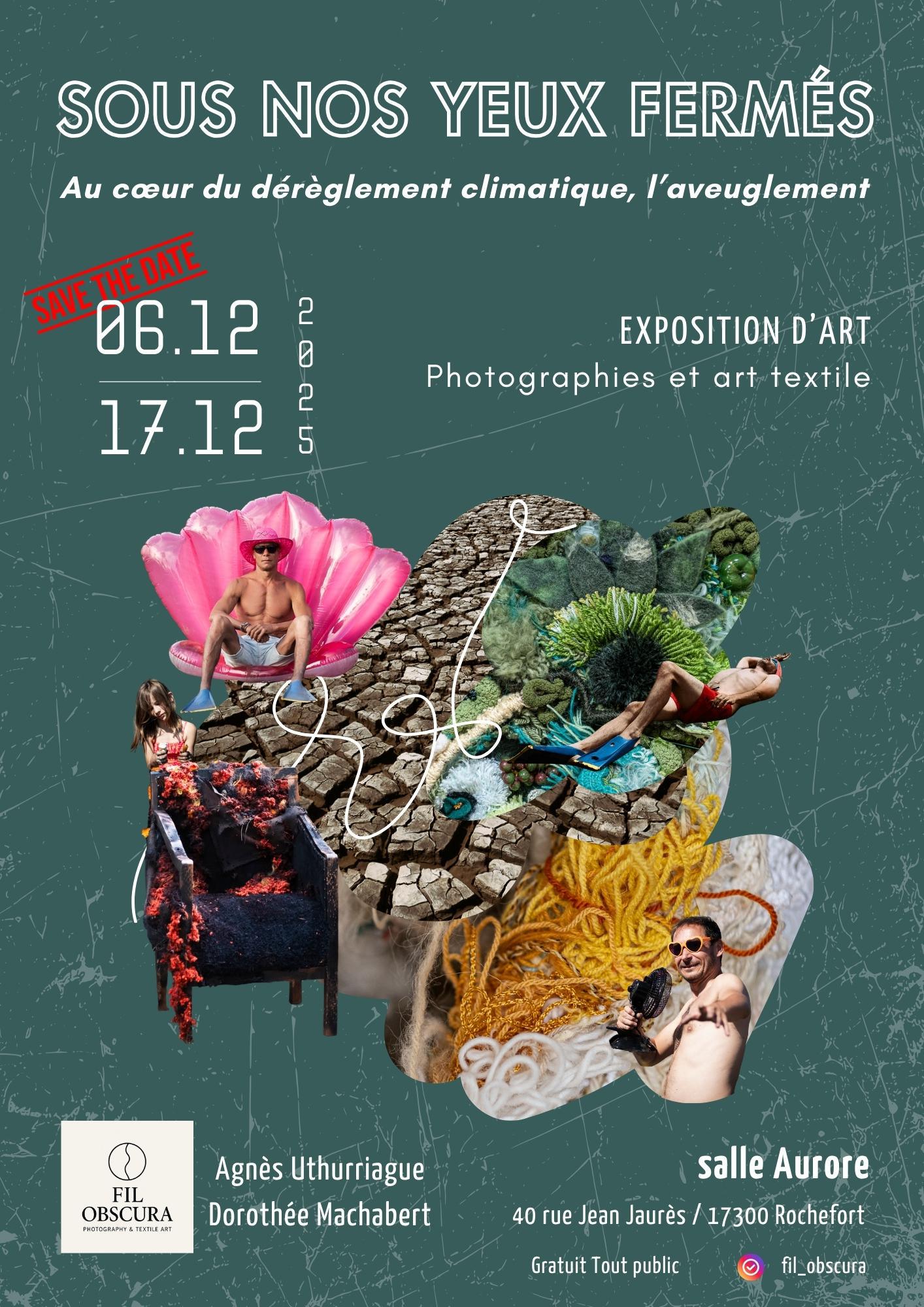 Résumé rapide : Du 6 au 17 décembre, l’exposition « Sous nos yeux fermés » s’installe à la salle Aurore de Rochefort. Un parcours mêlant photographies, textile art et réflexion sur le déni climatique, avec vernissage partagé et table ronde.