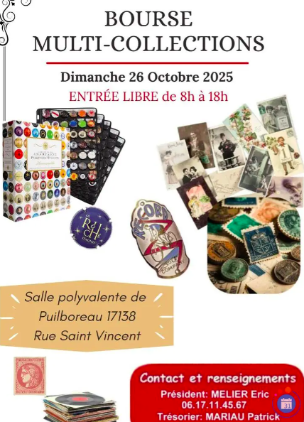 💿 Une journée pour les passionnés de collections ! Le dimanche 26 octobre 2025, la salle polyvalente de Puilboreau accueille la traditionnelle bourse multi-collections : timbres, cartes postales, monnaies, capsules, disques et objets anciens seront à découvrir. Un rendez-vous incontournable pour les amateurs et curieux de toutes générations.