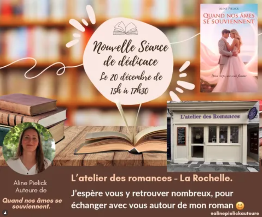 Résumé rapide : Aline Pielick sera en dédicace ce samedi 20 décembre à L’Atelier des Romances pour présenter son roman « Quand nos âmes se souviennent ». Un moment chaleureux pour échanger directement avec l’autrice.