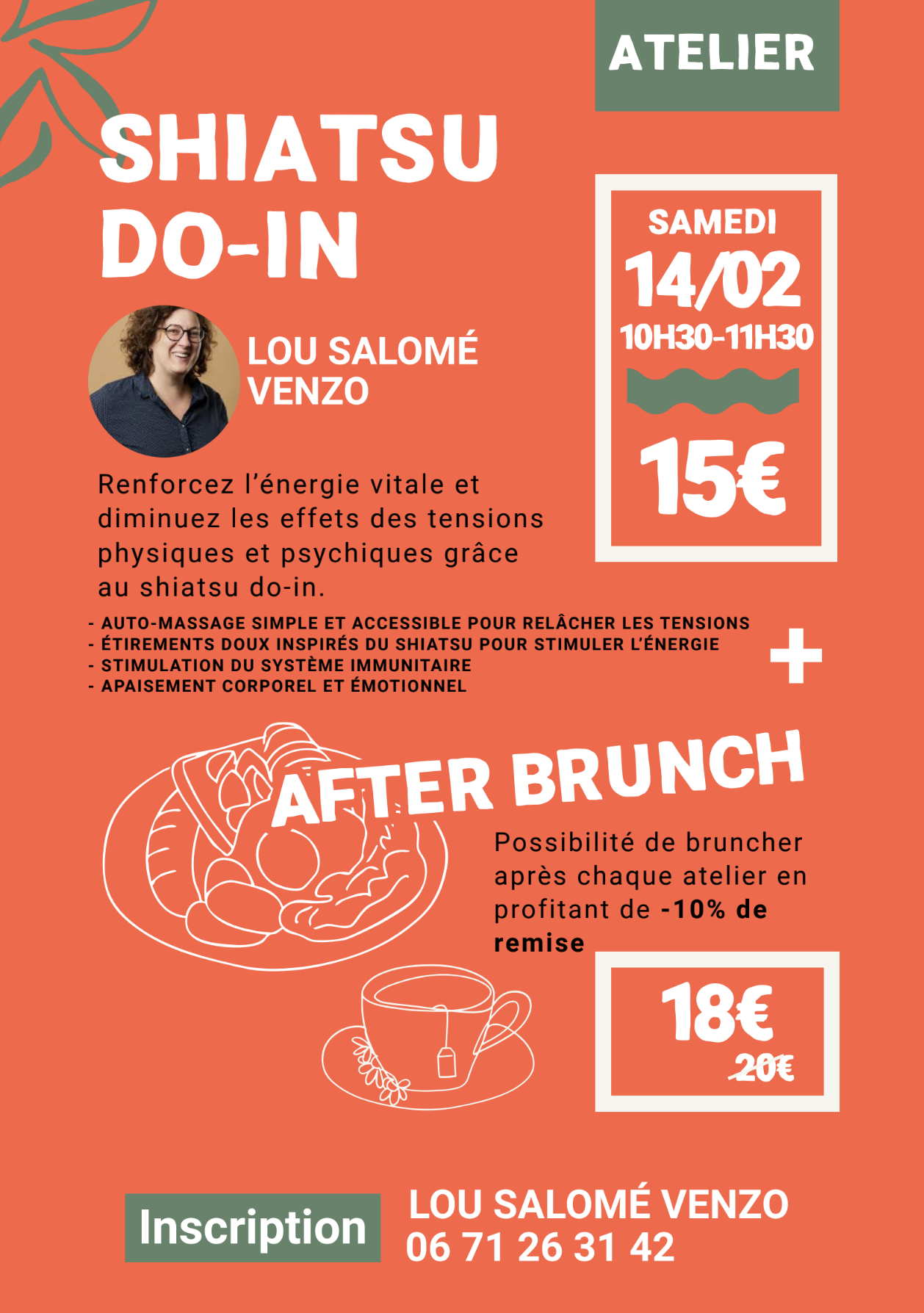 Le Shiatsu Do-In est une pratique japonaise mêlant auto-massage simple et étirements doux. Lou Salomé Venzo vous propose de stimuler votre système immunitaire et de renforcer votre énergie vitale. Cet atelier est idéal pour trouver un apaisement corporel et émotionnel immédiat dans une ambiance bienveillante.