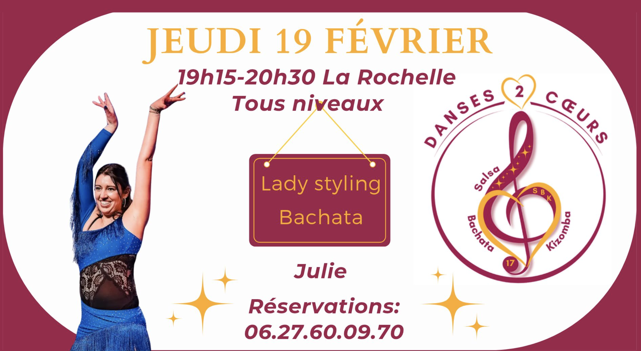 Le Lady Styling est l'art de personnaliser sa danse en solo pour mieux l'intégrer en couple. Durant 1h15, Julie vous accompagnera dans le travail du haut et du bas du corps, l'isolation, le jeu de jambes et surtout l'expression des bras. Que vous soyez débutante, expérimentée ou simplement passionnée, ce stage est ouvert à tous les niveaux. C'est l'occasion idéale pour affiner votre grâce et votre technique dans une ambiance bienveillante et dynamique au sein de l'école Danses 2 Cœurs.
