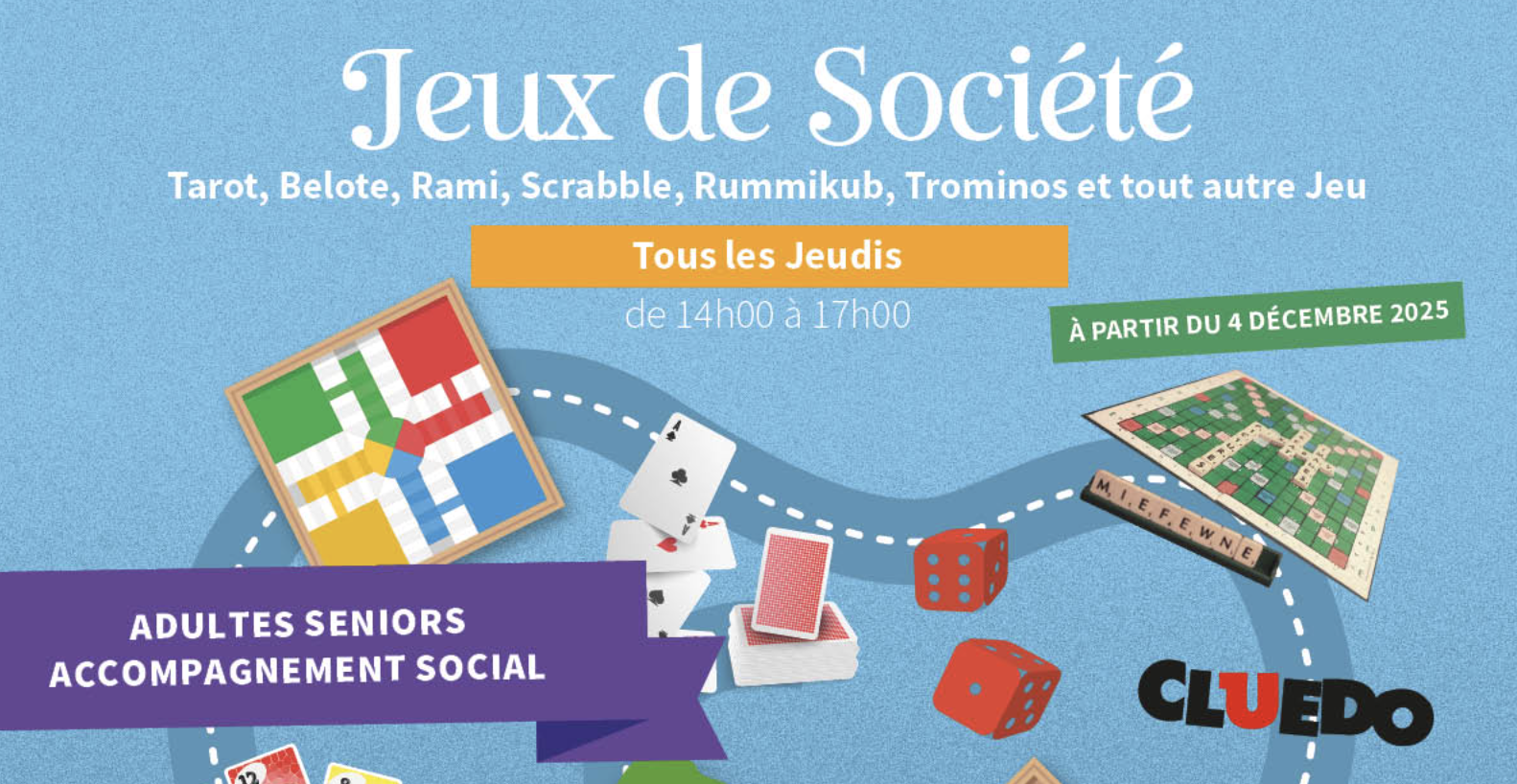 Le Centre Social & Culturel Vent des Îles organise un après-midi dédié aux jeux de société pour les adultes et seniors. Un moment de partage et de convivialité autour de classiques comme le Tarot, le Scrabble ou la Belote.