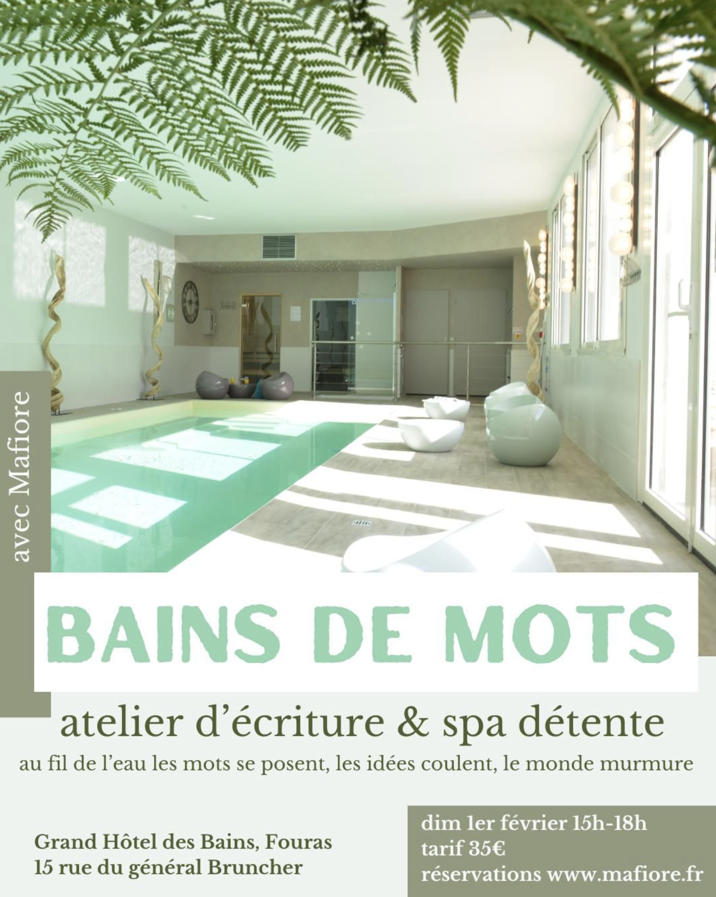 L'atelier "Bains de Mots" animé par Mafiore vous invite à une parenthèse littéraire unique. Au fil de l'eau, les mots se posent et les idées coulent dans un cadre apaisant. Cette expérience se prolonge par un accès privilégié aux installations du spa pour ancrer ce moment de bien-être. C'est l'occasion idéale de libérer sa créativité tout en prenant soin de soi à deux pas de la plage.