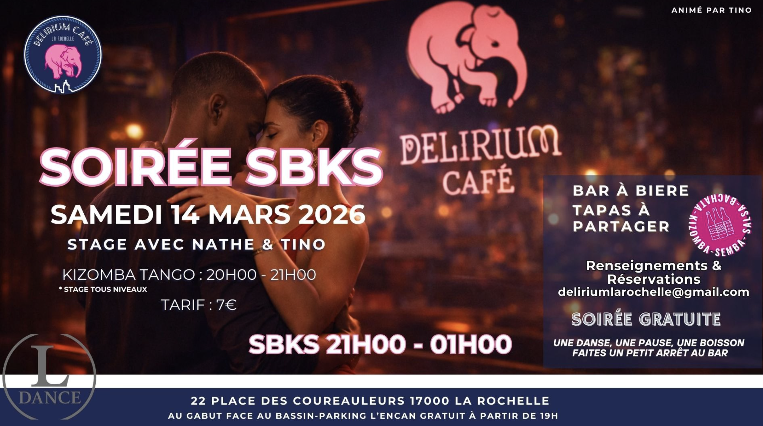 L'événement commence à 20h avec un stage de Kizomba Tango animé par Nathe & Tino, accessible à tous les niveaux. Dès 21h, la piste s'ouvre pour la soirée SBKS animée par Tino. C'est l'occasion idéale de pratiquer vos pas dans un cadre convivial tout en profitant de la large sélection de bières et de tapas du bar.