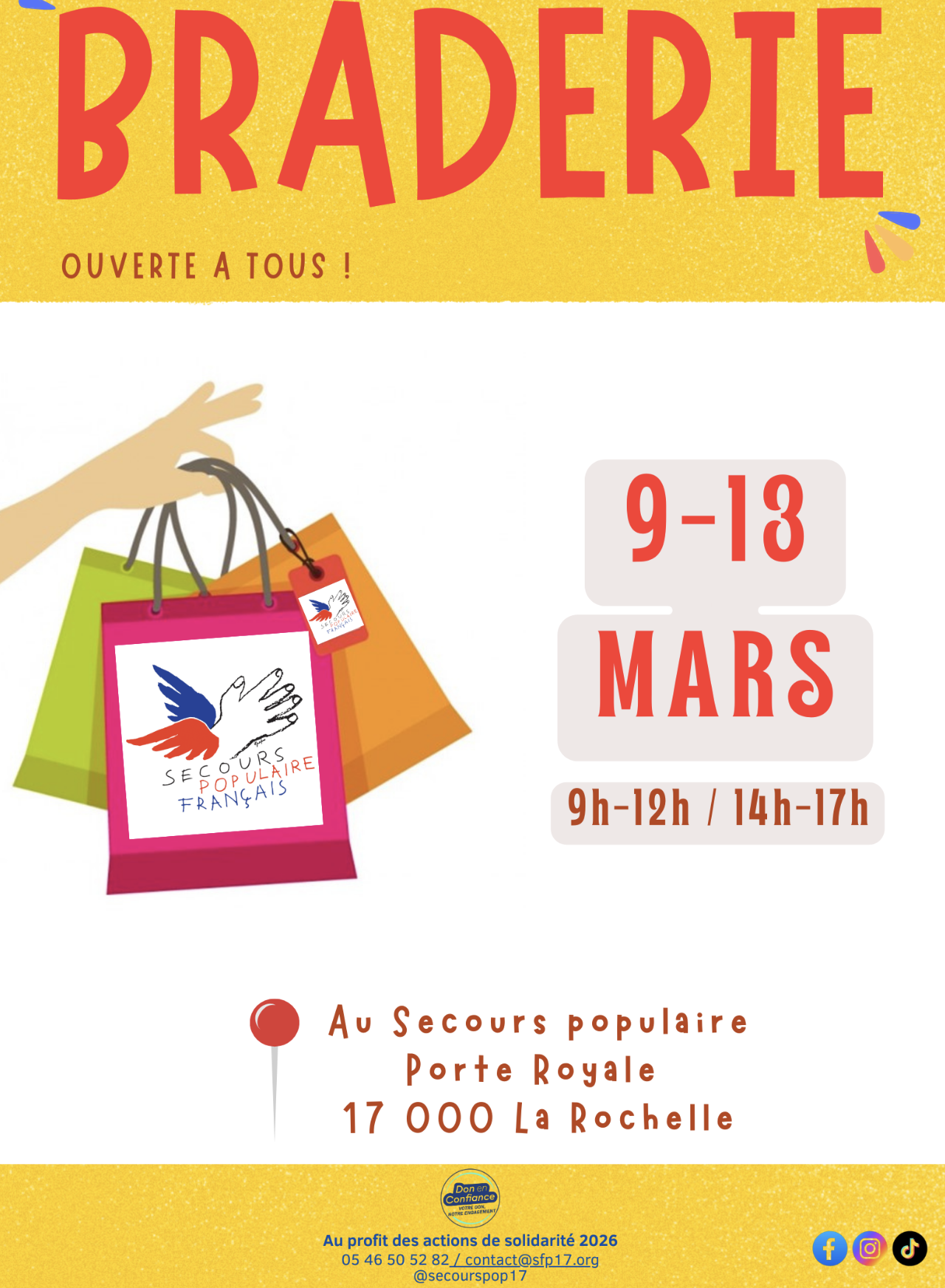 Face à une demande croissante, le SPF de La Rochelle mobilise ses bénévoles pour cette braderie exceptionnelle. Vous y trouverez un large choix d'articles neufs et d'occasion à tout petits prix : vêtements pour tous les âges, chaussures, accessoires de mode et linge de maison. Les bénéfices de cette vente servent directement à financer les missions de solidarité 2026 de l'antenne rochelaise.