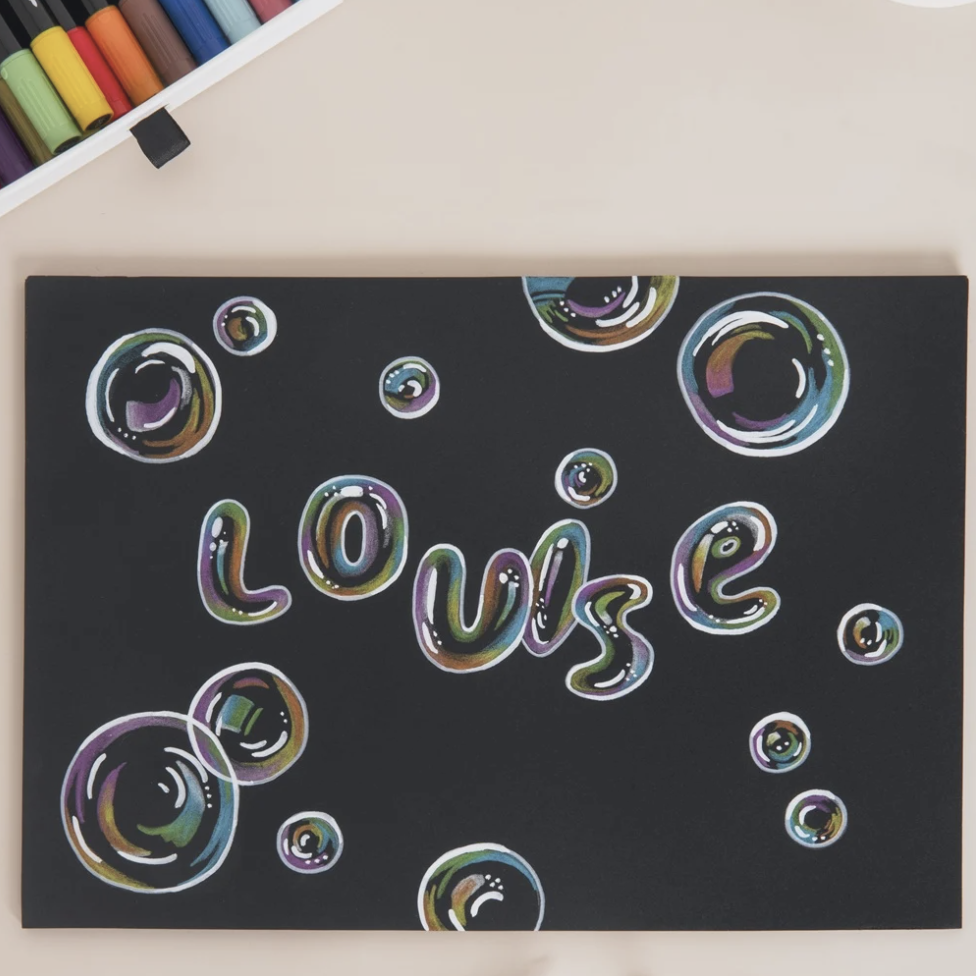 Lors de cet atelier, votre enfant apprendra à dessiner les lettres de son prénom — ou le mot de son choix — dans un style unique inspiré des bulles de savon. Grâce à l'utilisation de crayons de couleur spécialement conçus pour le dessin sur fond noir, il pourra créer des effets lumineux, translucides et colorés sur un support cartonné.