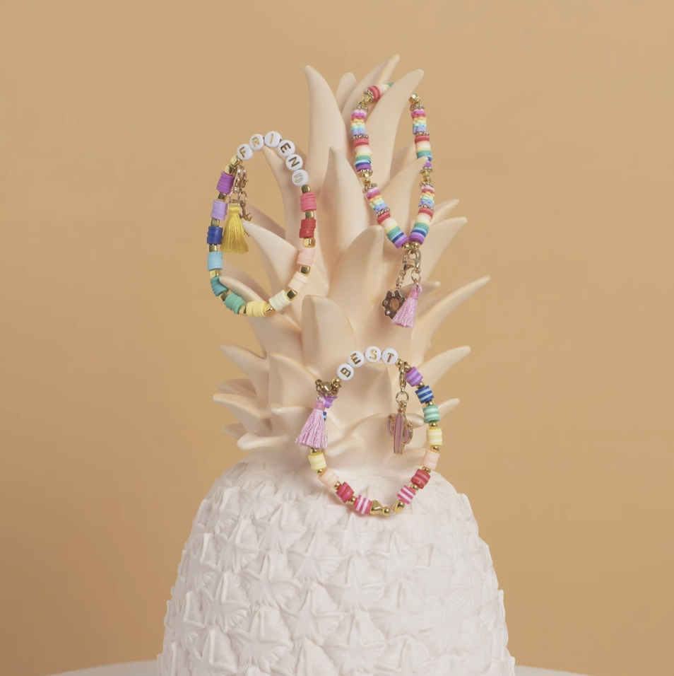 Lors de cet atelier, votre enfant réalisera un, deux, voire trois bracelets colorés agrémentés de jolies breloques. Il choisira ses couleurs de perles Heishi, composera des mots amusants avec des perles lettres et sélectionnera des breloques pour personnaliser ses créations. L'enfant repartira avec ses bijoux à son poignet ou dans un petit pochon, parfait pour offrir ou se faire plaisir.